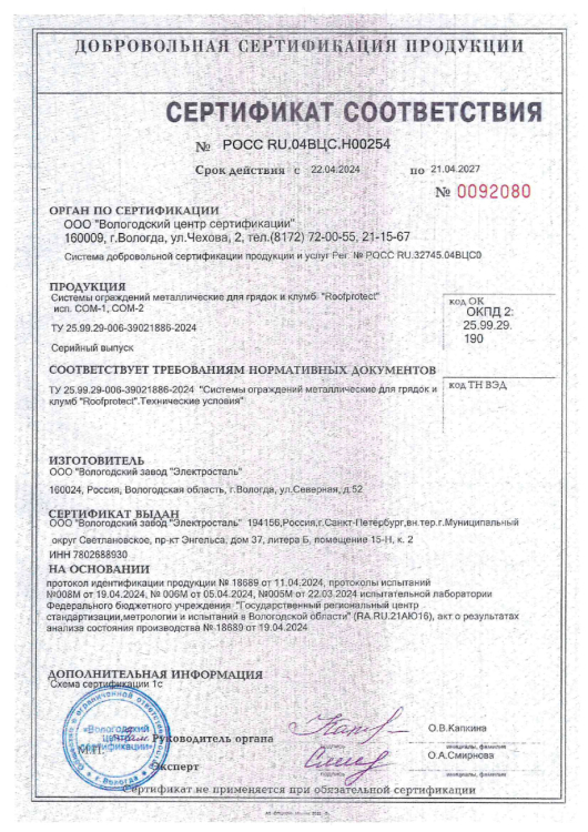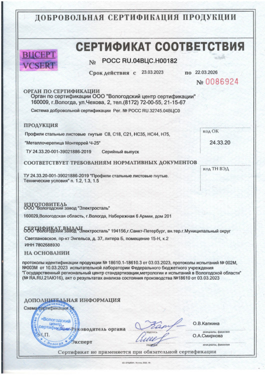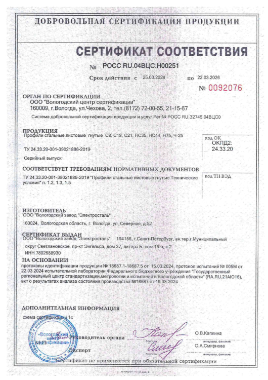 Все виды профнастила прошли добровольную сертификацию соответствия и её качество подтверждено документально